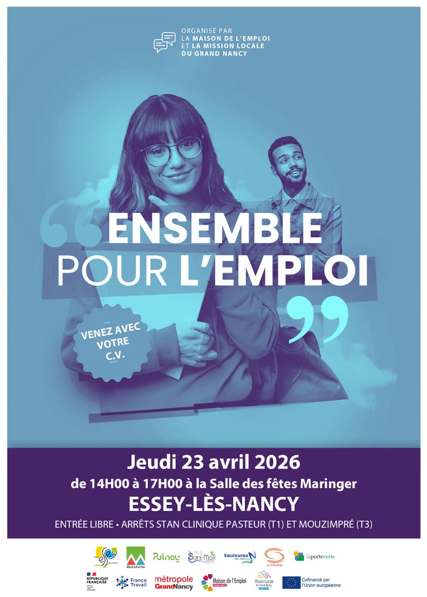 La Maison de l'Emploi et la Mission Locale du Grand Nancy, en partenariat avec France Travail, organisent le forum "Ensemble pour l'emploi" le jeudi 23 avril 2026 à Essey-lès-Nancy.
