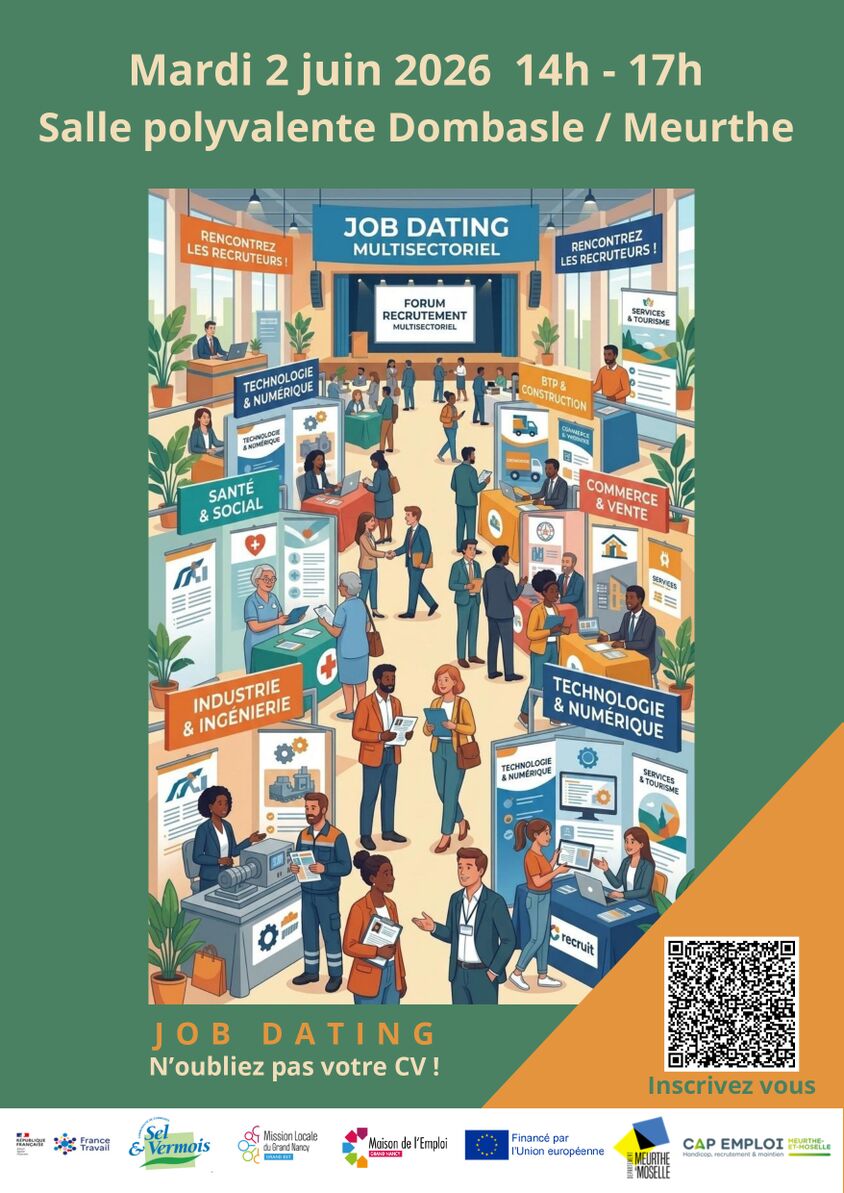 Rendez-vous le mardi 2 juin 2026, de 14h à 17h, à Dombasle-sur-Meurthe, pour échanger en direct avec des entreprises locales, des agences intérim ainsi que des structures d'insertion, toutes en recherche active de candidats.