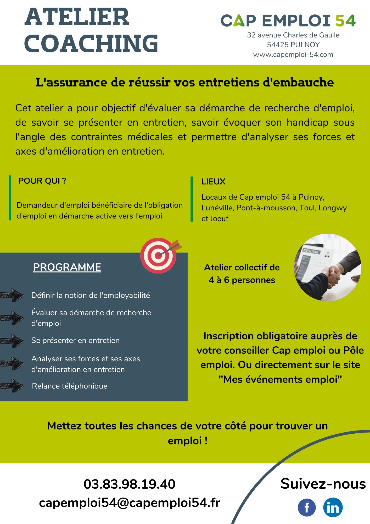 Cet atelier est réservé aux personnes bénéficiant de la Reconnaissance de la Qualité de Travailleur Handicapé, car animé par l’opérateur spécialisé Cap Emploi. Il a pour objectif d’évaluer sa démarche de recherche d’emploi, de savoir se présenter en entretien, savoir évoquer son handicap sous l’angle des contraintes médicales et permettre d’analyser ses forces et axes d’amélioration en entretien. Il doit vous permettre à mettre toutes les chances de votre côté pour trouver un emploi !